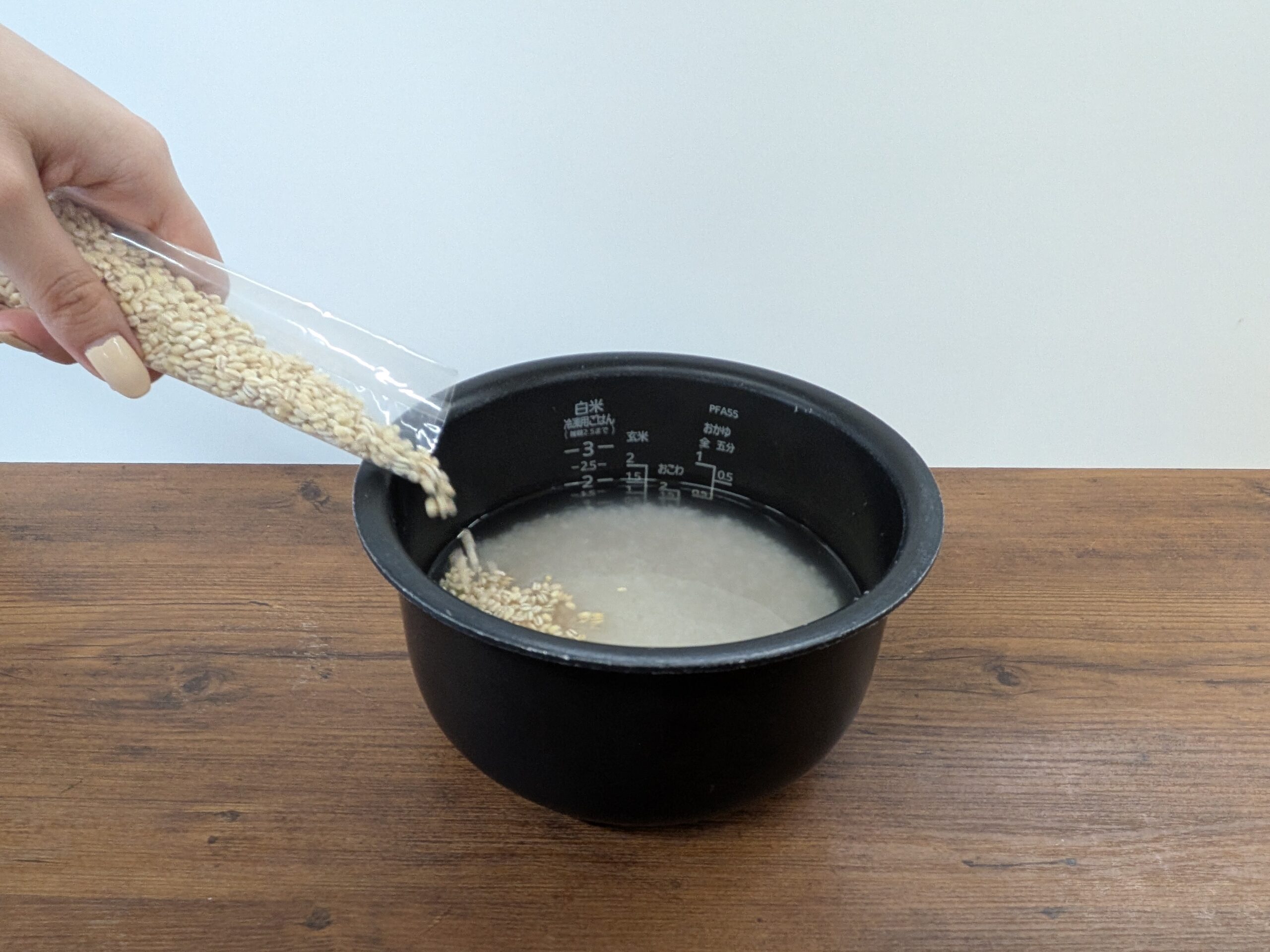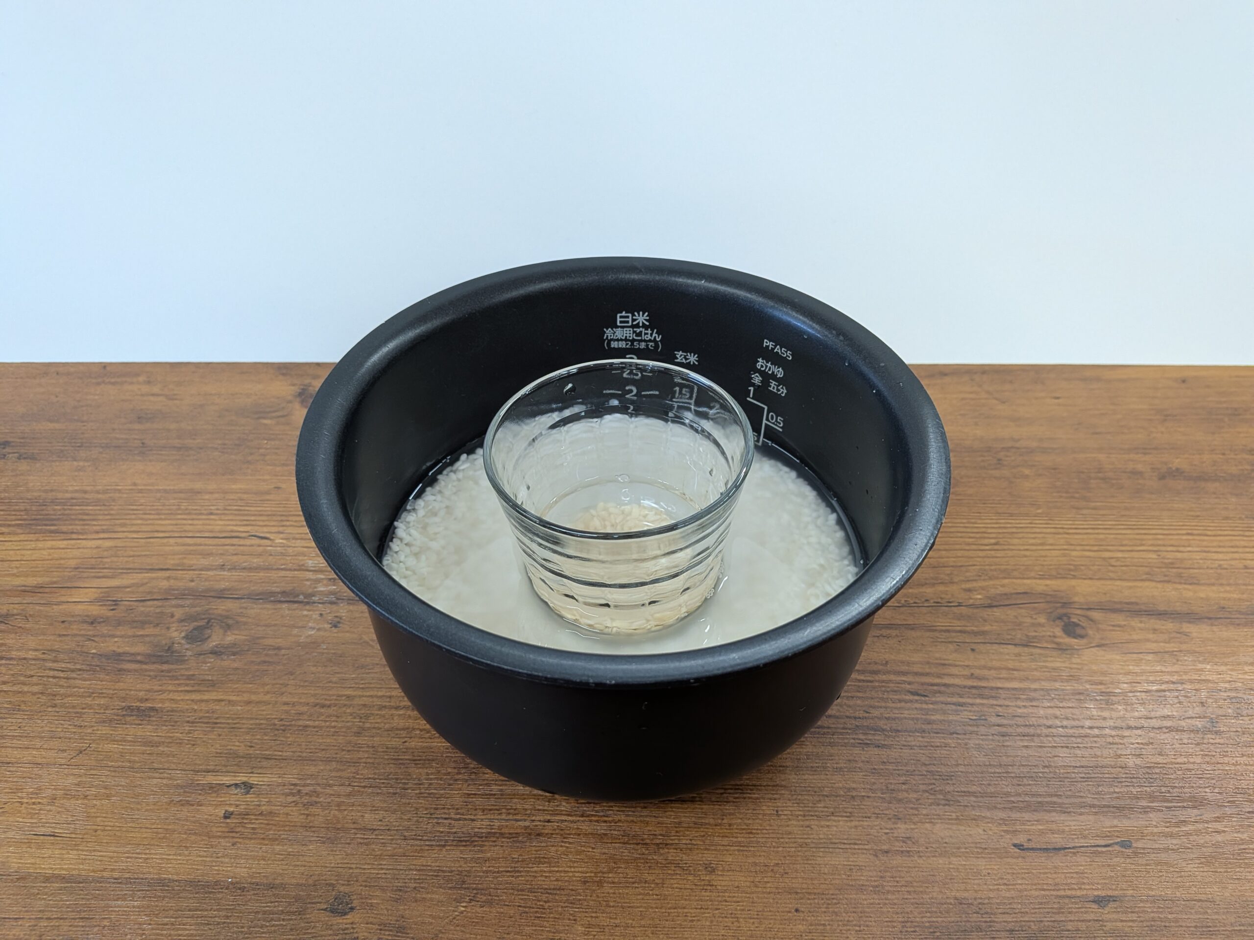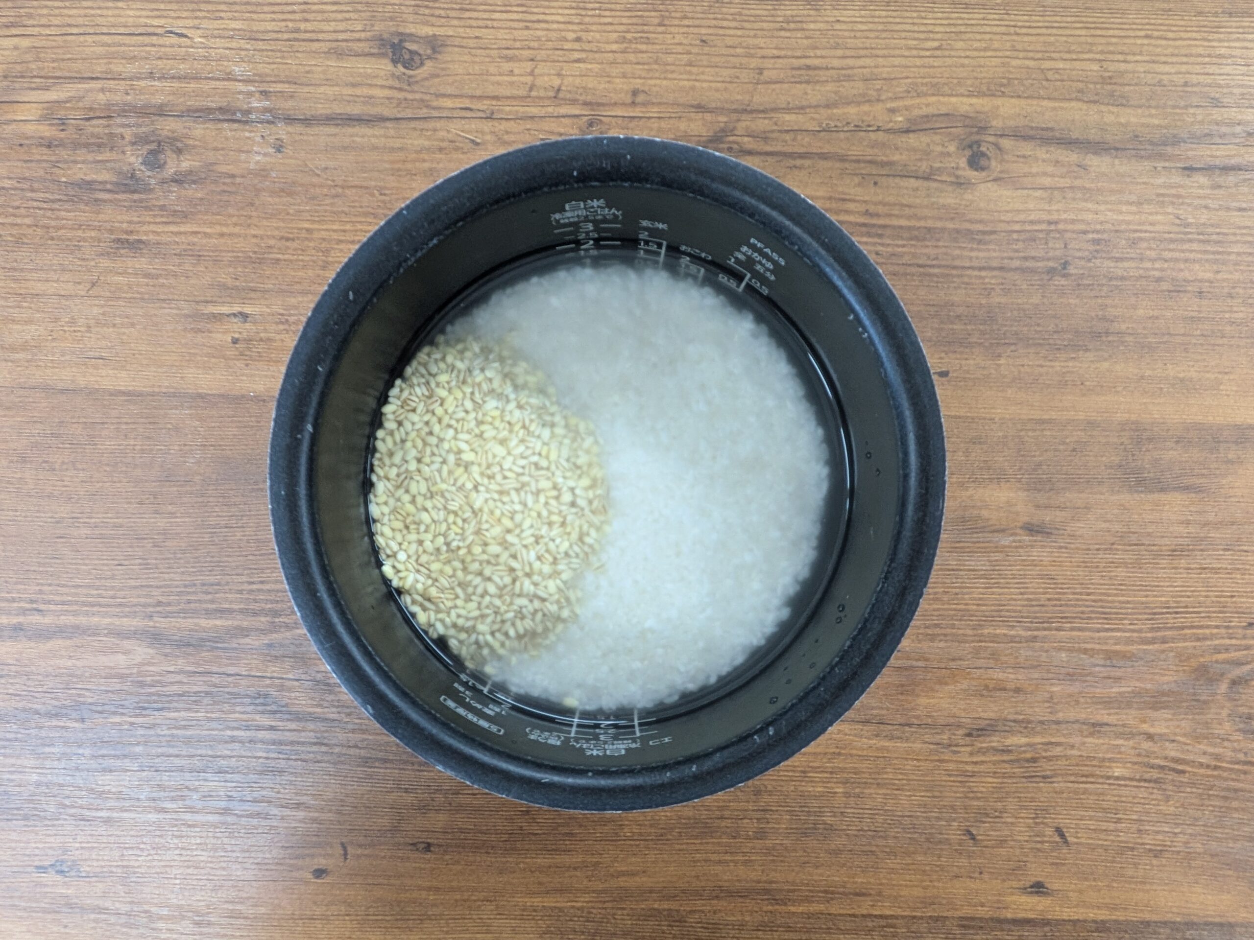 ① 炊飯器に、白米とそれに合わせた通常量の水をセットする。