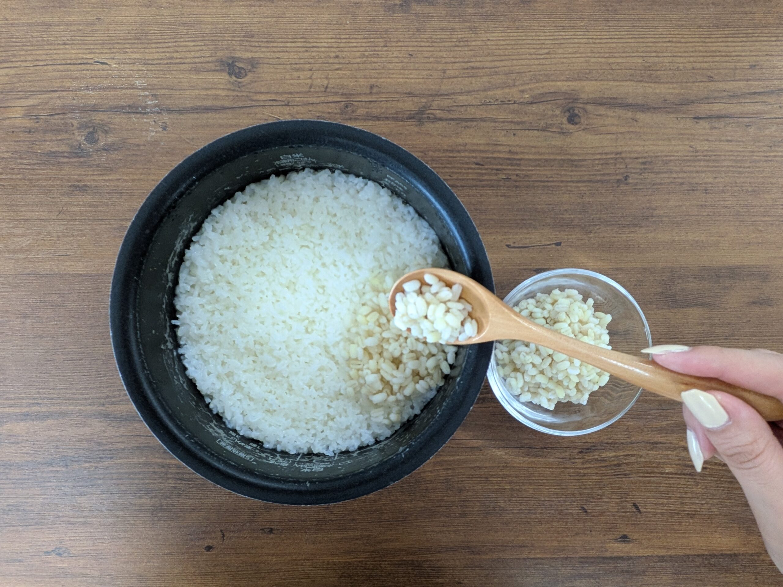 最後に、炊飯した白米に別ゆでしたもち麦をお好みの割合で加え、食べる前に混ぜ込む方法です。