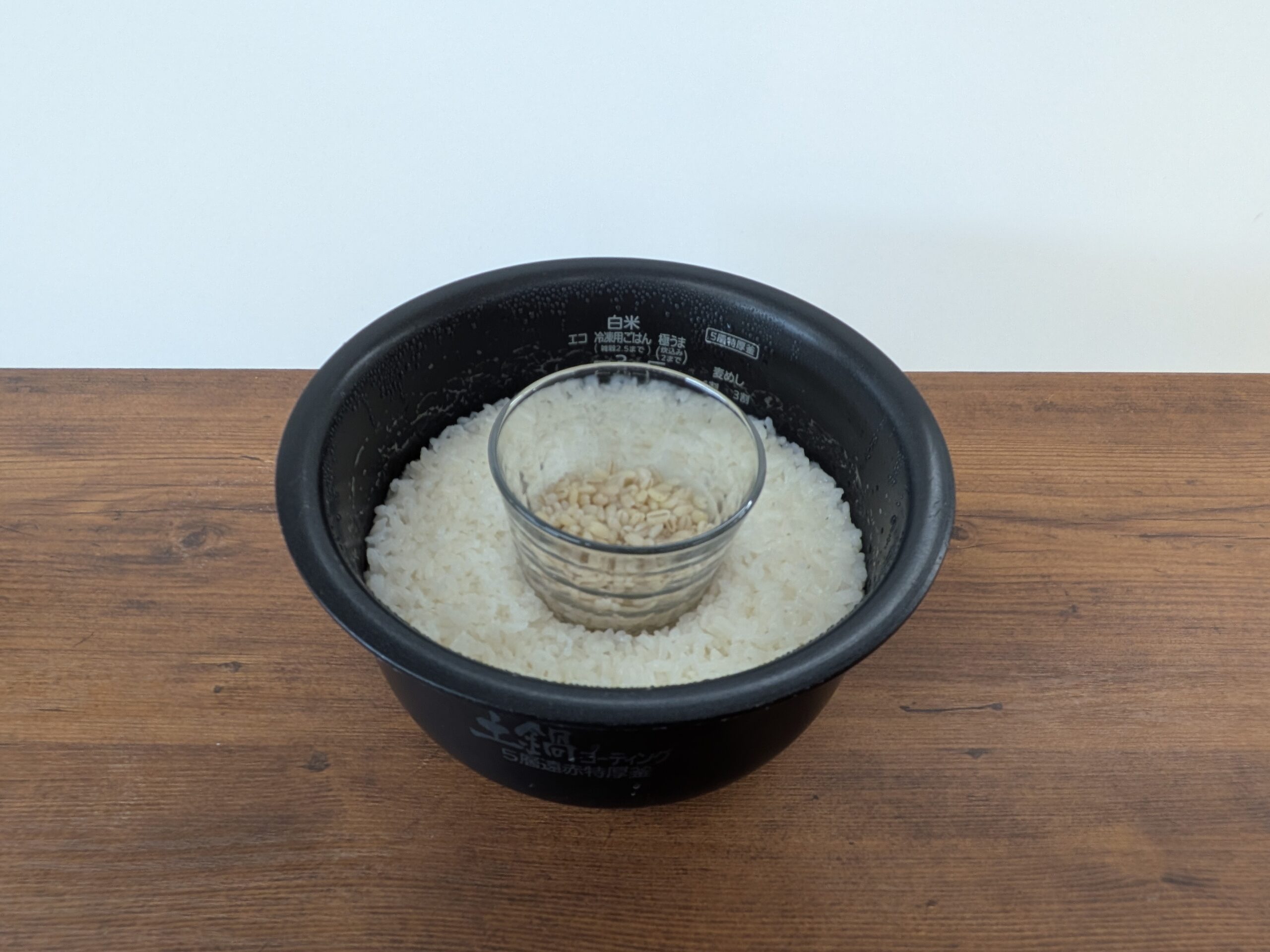 ② 耐熱カップに、もち麦ともち麦の炊飯に必要な量の水(今回はもち麦25g:水50ml)を入れ、①の炊飯釜の中央に押し込むように入れる。