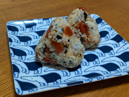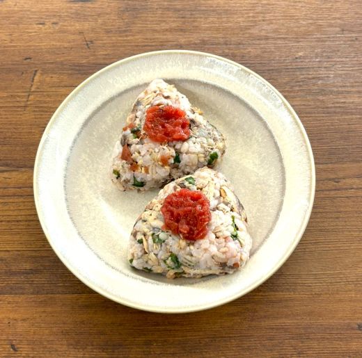 サバのうま味引き立つ、梅と大葉のもち麦おにぎり